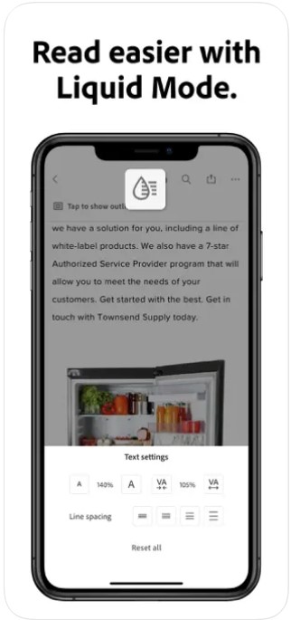 Adobe Acrobat Reader เป็นแอพพลิเคชันสำหรับอ่านและจัดการไฟล์ PDF ที่มีความสามารถมากมาย เช่น การเปิดและอ่านไฟล์ PDF ในโหมดดูหน้าเดียวหรือโหมดการเลื่อนหน้าต่อไป โหมดเต็มจอ การเข้ารหัสและถอดรหัสไฟล์ PDF การเซ็นต์เอกสารด้วยเครื่องหมายลายมืออิเล็กทรอนิกส์ การสร้างและแก้ไขเอกสาร PDF การค้นหาข้อมูลภายในไฟล์ PDF และอื่นๆ